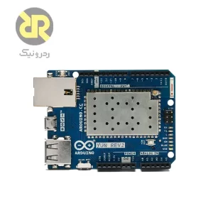 برد آردوینو Arduino Yún Rev 2, برپایه میکروکنترلر ATmega32U4, با حافظه فلش 32 کیلوبایت و سرعت کلاک 16 مگاهرتز, با 20 پایه دیجیتال و 12 پایه آنالوگ و پشتیبانی از پروتکل های UART ,I2C ,SPI و اتصال بی سیم وایفای و با سیم اترنت